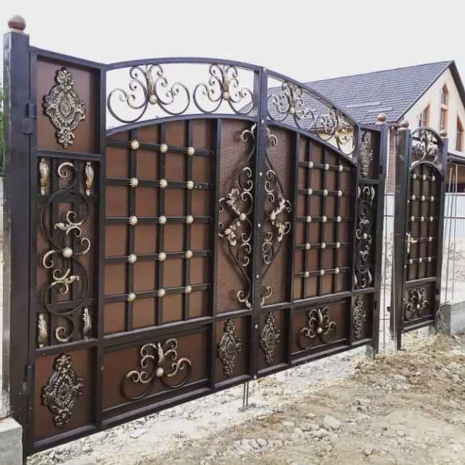 Метал ворота на заказ гаражные и въездные, ровные и витые, сложные и простые, несложные и кованые металлические ворота с замечательной ковкой оригинальной в мастерском исполнении дизайнерского подхода, дорогие и дешевые бюджетные, ровные и арочные, глухие с прозрачными смотровыми решетками, гаражные в гараж а дверью, автоматические въездные во двор с калиткой, с пиками, со столбиками. Купить просто с профлиста и кованые ворота откатные, распашные, подъемные, сдвижные. Можно выбрать металл 3 мм, 2 мм, 1,5 мм, каркас и профлист, цвета, замки, задвижки. Иллюстрация работ на фото строительного сайта 004.