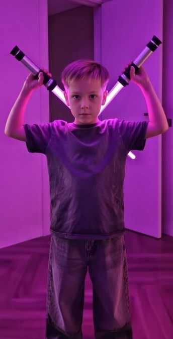 Разделите на два меча для эпичных дуэлей с друзьями или используйте как один — идеально для косплея, фотосессий в стиле "Месть ситхов" или ночных ролевых игр под звёздами. Комплект: 2 рукояти, 2 клинка, коннектор, USB-зарядка и инструкция. Вес около 700 г — лёгкий, но внушительный, чтобы почувствовать себя повелителем галактики.