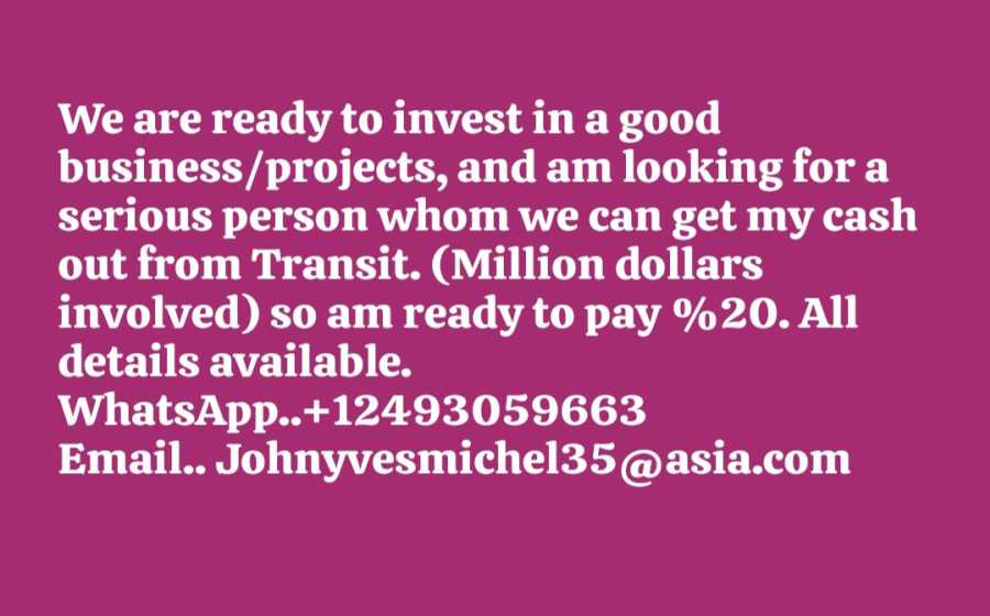 ищем серьезного человека, которому мы сможем вывести мои деньги из транзита (речь идет о миллионах), поэтому я готов заплатить 20%. Все подробности доступны.