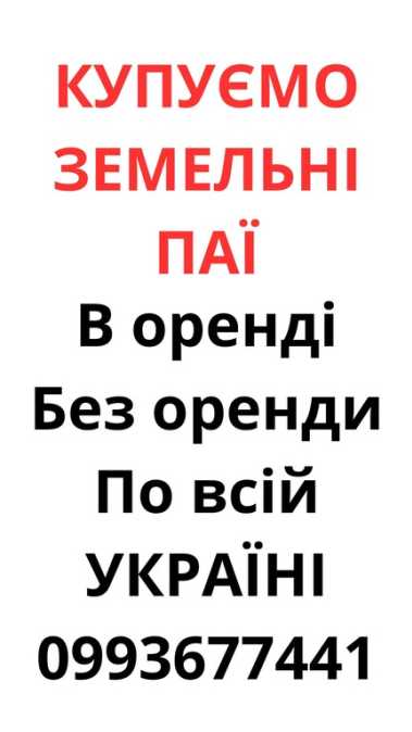 Купуємо ЗЕМЕЛЬНІ ПАЇ по всій Україні! - Найкраща ціна по ринку - В оренді - Без оренди - Наше оформлення - Юридичний супровід Для консультації з приводу продажу вашого паю дзвоніть за номером або пишіть у вайбер.